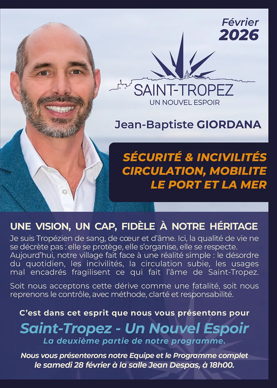 Ce flyer de février ne remplace pas celui de janvier. Il le complète. Janvier posait les fondations : habiter Saint-Tropez, mieux piloter la commune, recréer du lien. Février entre dans le concret du quotidien, sans détour, sans posture, sans promesse irréaliste.